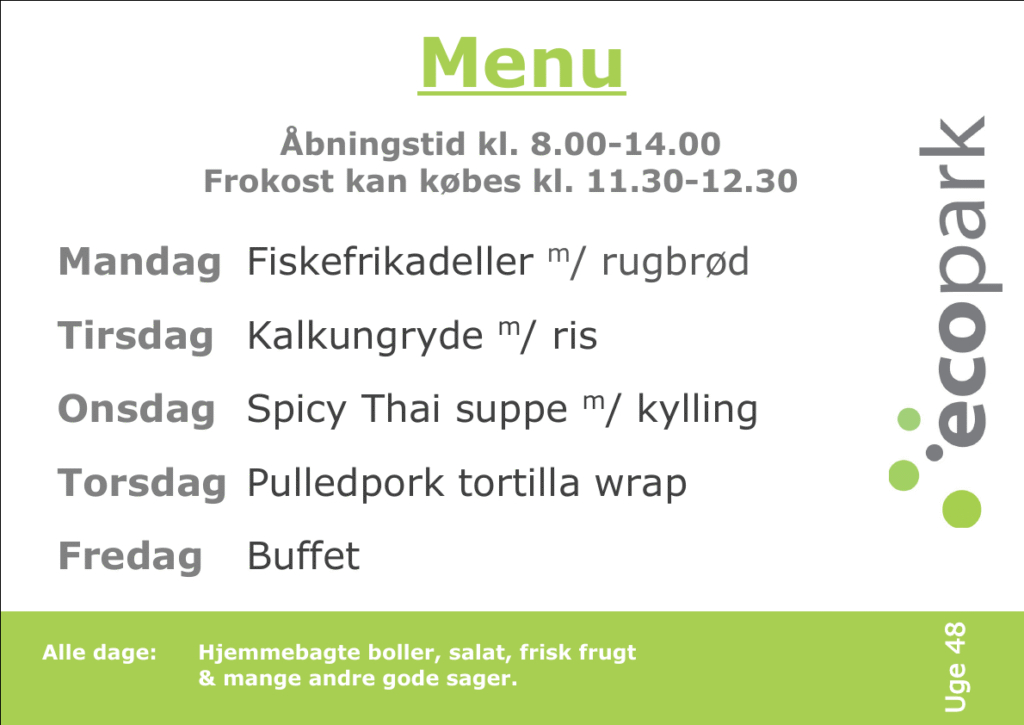 I Ecoparks kantine kan du købe morgenmad, frokost, kage til kaffen og mange andre gode sager – alt sammen til rimelige priser. Kantinen har økologisk bronzemærke og bager selv brød og kage.